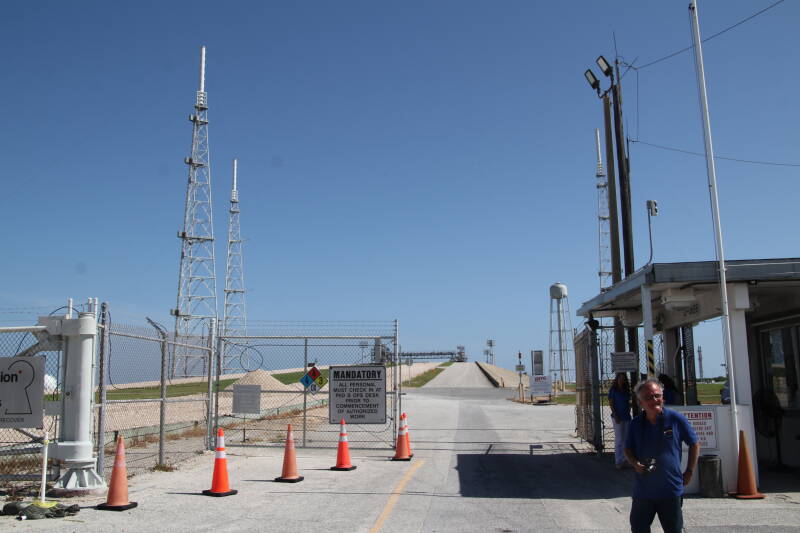 Alors que nous étions au pied du pad, occupés à prendre des photos et à rêver, nous voyons notre escorte NASA s’entretenir avec des personnes dans le « Gate » nous séparant de l’intérieur du complexe de lancement …. Suspense… est-elle en train de négocier l’autorisation suprême d’accéder au pad ?