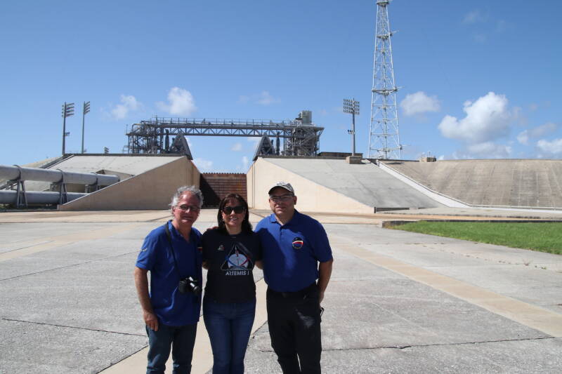 Et nous nous sommes retrouvés à l’arrière, dans le déflecteur de flammes remis à neuf (le pas de tir 39B n’avait plus été utilisé depuis l’époque des navettes spatiales). Le temps de quelques photos, puis direction le sommet du pad de tir et la plate-forme de lancement ! Incroyable de nous retrouver là avec le maître des lieux himself !
