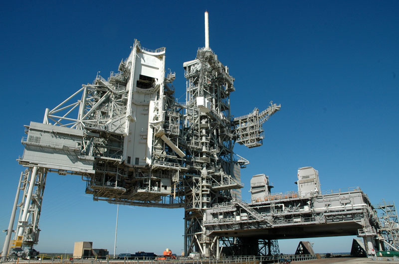 Launch Pad 39B at NASA's Kennedy Space Center, Fla., as seen in December 2007, a year after the pad's final space shuttle launch but before the fixed (at center) and rotating (at left) service structures began being dismantled. The mobile launch platform to the right was moved by crawler transporter off the pad and back to the Vehicle Assembly Building three miles away. - Photo: collectSPACE